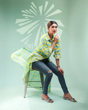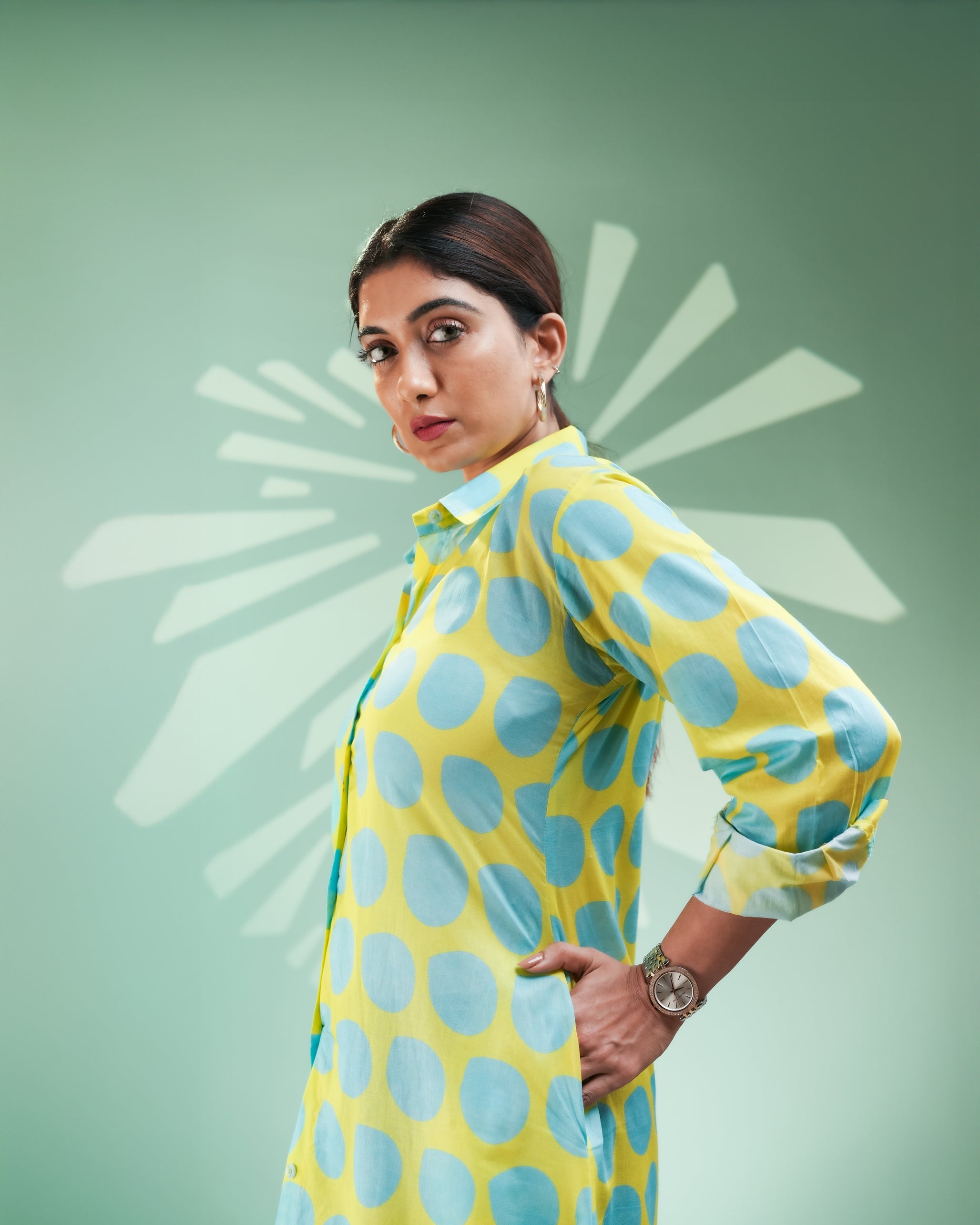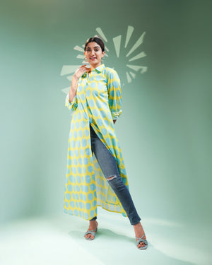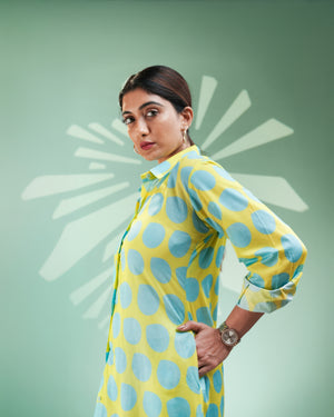 Turn heads with playful charm in our “Aqua Pop Shirt Dress”, a bold and breezy piece perfect for urban chic styling.