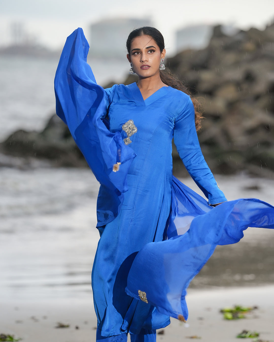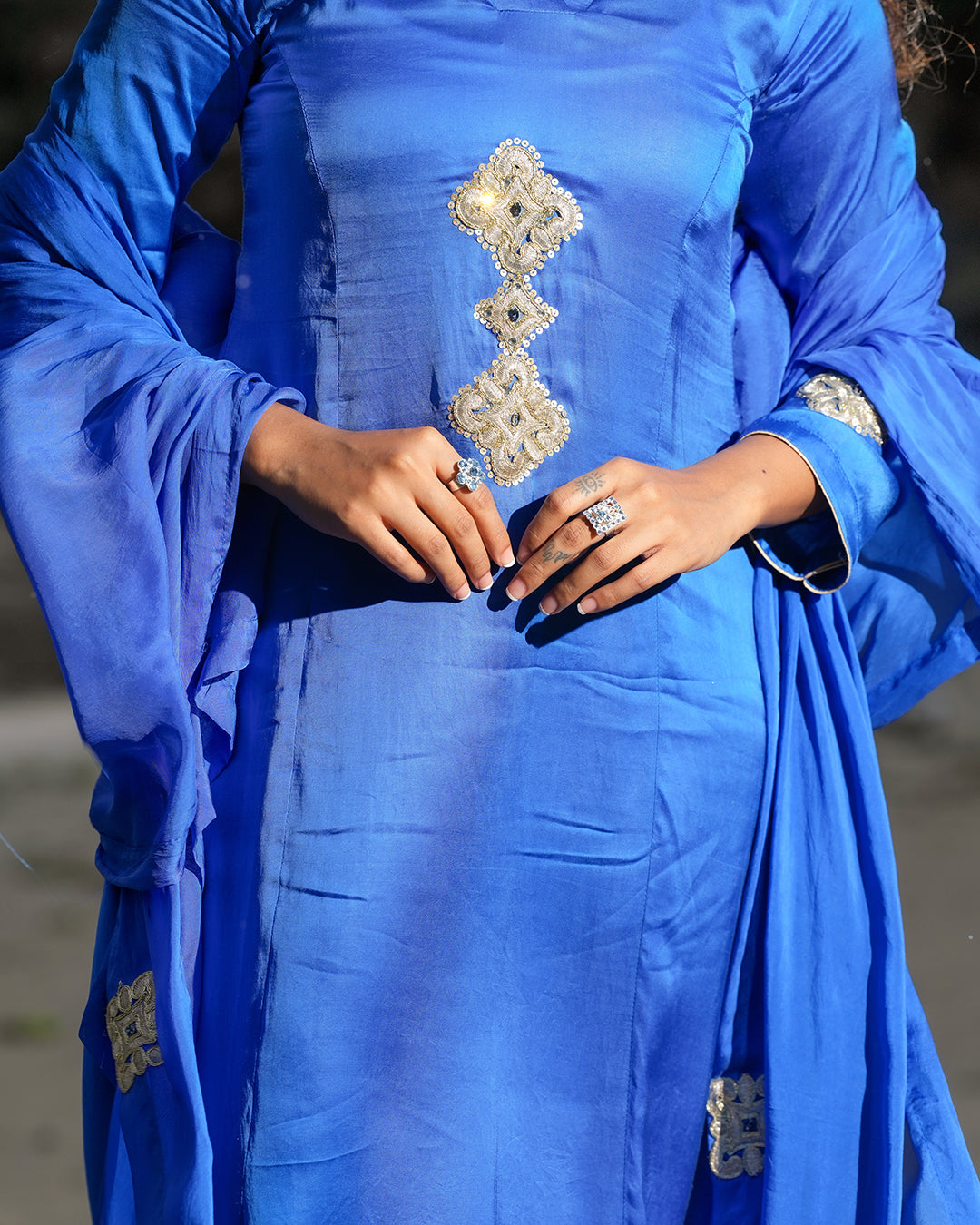 Draped in a vivid azure-blue hue, this ensemble features a classic V-neck kurta adorned