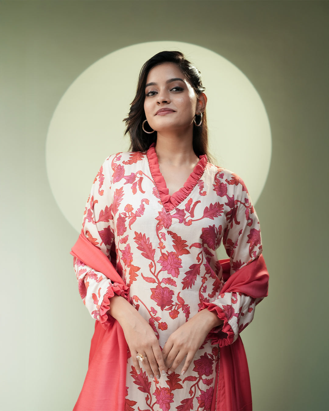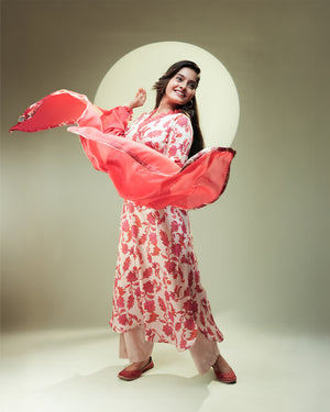 Paired with a plain off-white palazzo and a solid coral-red dupatta.