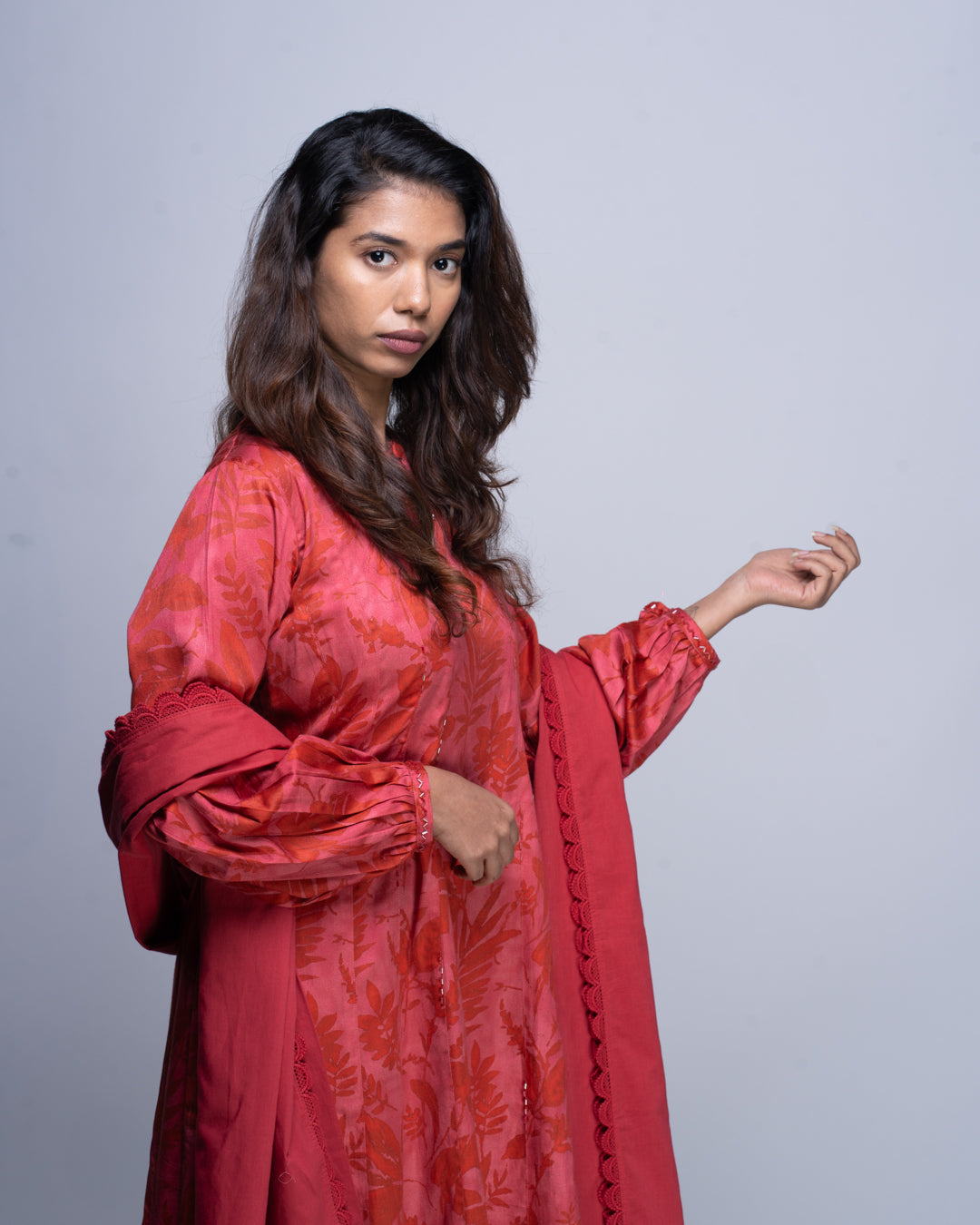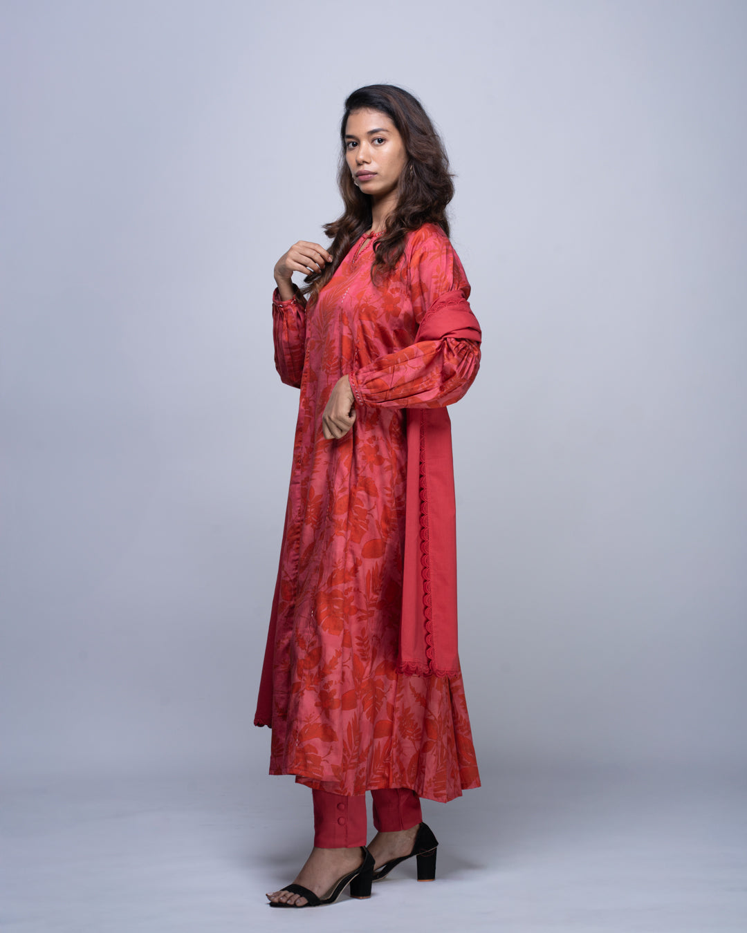 This crimson three-piece set features a flowy botanical print kurta with key hole neckline,cut dana hand work at the panels , gathered sleeves, straight pants and a scallop edged dupatta.