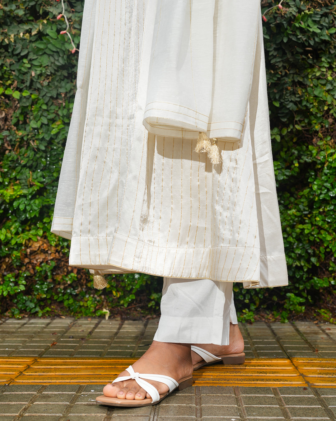 This outfit is perfect for festive occasions or elegant day events. Its a graceful blend of traditional and minimalistic elegance, ideal for someone who prefers subtle sophistication over heavy embellishment. Featuring subtle gold thread detailing, straight pants and a matching dupatta with tassel accents. Crafted from a premium Silk fabric.