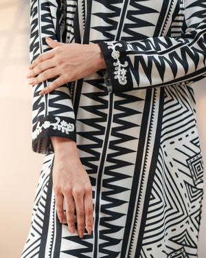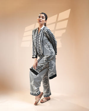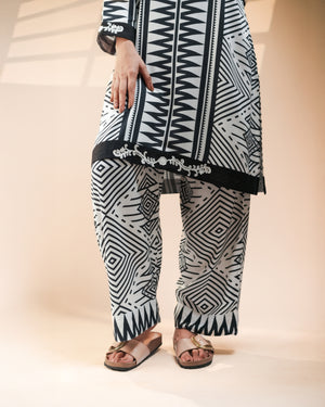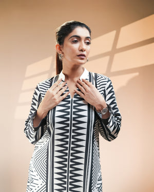 Make a statement with our monochrome cotton co ord set featuring tribal and geometric prints. Breathable, bold, and perfect for daily elegance. This co ord set has a straight silhouette