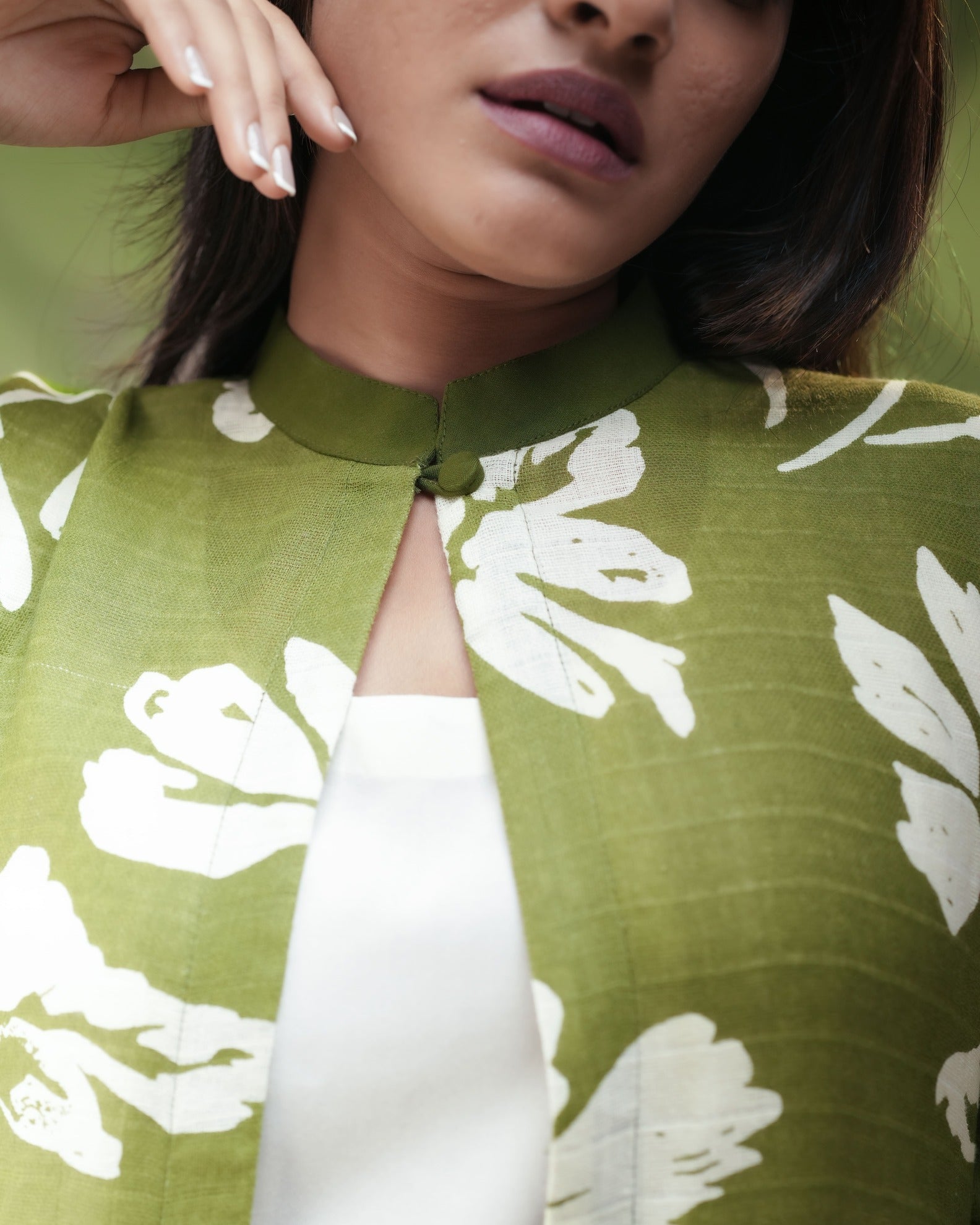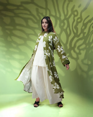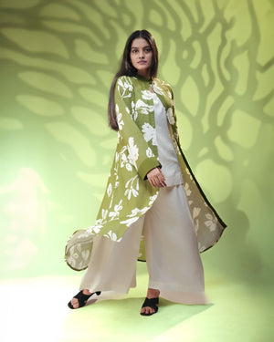 This ensemble features a flowy, front open love green long jacket adorned with white floral prints, creating a striking yet soothing visual. Paired with a breezy ivory short inner top and wide-legged ivory palazzo. The manadrin collar adds sophistication.