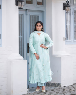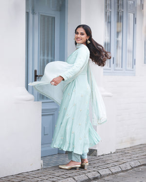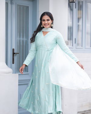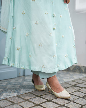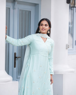 This pastel mint ensemble is adorned with delicate floral embroidery,