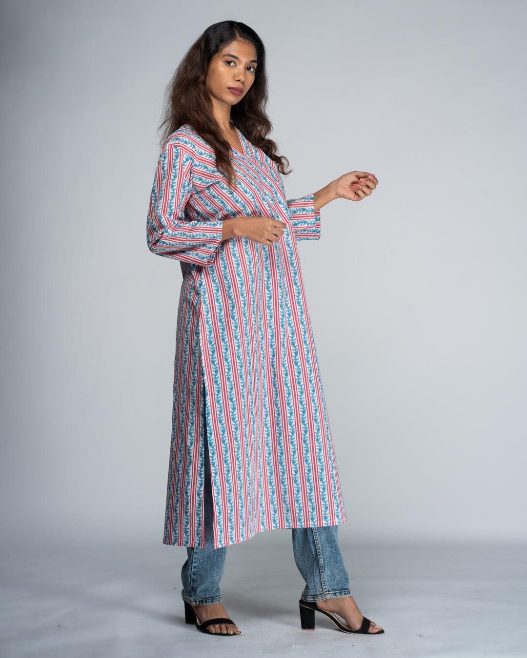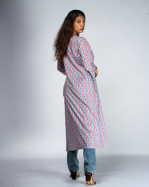 Tailored in a lightweight cotton fabric, this piece features vertical stripe motifs in coral pink and sky blue with leafy detailing,